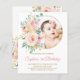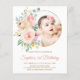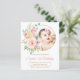 Blush Pink flowers baby’s first birthday invitation featuring green eucalyptus leaves & pink watercolor roses and golden wreath