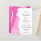 The left-hand edge of this elegant modern wedding invitation features a pink watercolor agate border trimmed with faux silver foil. The customizable text combines handwriting, copperplate and italic fonts in charcoal gray on a white background. The reverse side features a matching pink and silver agate design.