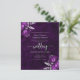 This elegant wedding invitation features plum floral bouquets set off with silver faux foil greenery in two corners, on a background image of purple watercolor agate. The customisable silver grey text combines serif, italic and handwriting fonts. The reverse side provides space for wedding details, along with a QR code guests can scan to visit your website and RSVP.