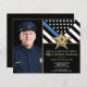 This design features a police force flag with black and white stripes, and a thin blue line stripe as well. The police badge and gold text sits above all of the party details for the retiring law enforcement officer, sheriff, captain, or chiefs retirement party details. Customise this design even further with the photo of the retiring police officer.