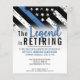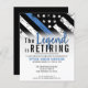 This design features a police force flag with black and white stripes, and a thin blue line stripe as well. "The Legend is Retiring" text sits above all of the party details for the retiring law enforcement officer, sheriff, captain, or chiefs retirement party details.