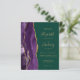 The left-hand edge features a purple watercolor agate border trimmed with gold faux glitter. The customisable text combines gold-coloured handwriting, copperplate and italic fonts on an emerald green background. The purple and gold agate design is repeated on the back of the card.