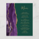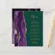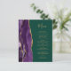 The left-hand edge of this elegant modern wedding menu features a purple watercolor agate border trimmed with faux gold glitter. The customisable text combines gold-coloured handwriting script and copperplate fonts on an emerald green background. The reverse side features a matching purple and gold agate design.
