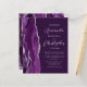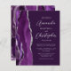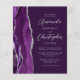 The left-hand edge of this elegant modern wedding invitation features a purple watercolor agate border trimmed with faux silver glitter. The customisable text combines silver grey script and sans serif fonts on a plum background. The reverse side features a matching purple and silver agate design.