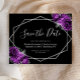 This elegant budget wedding save-the-date card features a silver geometric frame decorated with purple and silver flowers on a black background. The customisable text combines silver grey whimsical handwriting, copperplate and italic fonts.