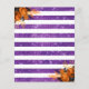 This fall-themed birthday party invitation features an elegant unicorn face with purple faux glitter horn adorned with an orange, black and purple floral bouquet. You can customise the name of the birthday girl and the number of the birthday, which appear in purple handwriting font. Behind the rectangular frame is a background of purple glitter and white stripes. Orange and black floral bouquets decorate two of the corners. The same bouquets appear on the back of the card on a matching background.