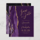 The left-hand edge of this elegant modern wedding save the date card features a purple watercolor agate border trimmed with faux gold glitter. The customisable text combines gold-coloured script and sans serif fonts on a plum background. The reverse side features a matching purple and gold agate design.