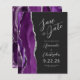 The left-hand edge of this elegant modern wedding save the date card features a purple watercolor agate border trimmed with faux silver glitter. The customisable text combines silver grey script and sans serif fonts on a slate black background. The reverse side features a matching purple and silver agate design.