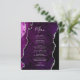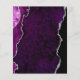 This elegant modern wedding menu features a purple watercolor agate background trimmed with faux silver glitter. The customizable text combines silver gray handwriting script and copperplate fonts. The reverse side features a matching purple and silver agate design.