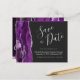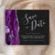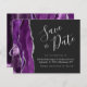 This elegant budget save the date card features a purple watercolor agate border trimmed with faux silver glitter. The customisable text combines silver grey handwriting script and copperplate fonts on an off-black background. The reverse side features a matching purple and silver agate design.