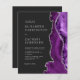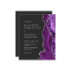 The right edge of this elegant modern wedding invitation features a purple watercolor agate border trimmed with faux silver glitter. The customisable text combines silver grey serif, copperplate and italic fonts on a slate black background. The reverse side provides space for wedding details on a solid slate black background, along with a QR code guests can scan to visit your website and RSVP, which saves the cost of printing and mailing separate RSVP cards.