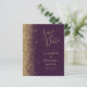 The left-hand edge of this elegant modern wedding save the date card features a gold faux glitter border. The customisable text combines gold-coloured handwriting, copperplate and italic fonts on a purple violet background. The reverse side features a matching purple violet and gold design.