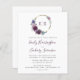 This wedding design features the bride and groom's monogram initials in dark purple framed by a watercolor wreath of purple flowers on a gold faux foil circle. Personalise the text with the couple's names in elegant dark purple handwriting script and the wedding details in charcoal grey. The reverse side provides space for wedding details on a solid white background, along with a QR code guests can scan to visit your website and RSVP, which saves the cost of printing and mailing separate RSVP cards.