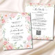 Budget All in One with Details and QR Code Pink Roses Sage Greenery Wedding Invitation... Our budget "All in One" floral wedding invitation features an array of pastel pink roses and leafy sage greenery framing your invitation text on front of the card. The back of the card, bordered with pink roses on top and bottom, contains all of the details you would typically see on separate cards in the wedding packet. This modern style wedding invitation was designed to be both elegant and budget conscious... not to mention time-saving. On the back there is also a QR code graphic template you can easily replace by typing in your own wedding website URL. All example text can be easily revised with your own information on the personalisation template. PLEASE NOTE: "Budget" card paper is not the same as the traditional flat card invitations. Our budget cards are 4.5 x 5.6 inches made of semi-gloss 110 lb paper compared to traditional wedding invitation flat cards at 5 x 7 inches in matte paper at 120 lb weight. Also, the budget cards do not automatically come with envelopes, as do the traditional invitation cards, but you can purchase them on the same page at checkout if you wish. This all in one design is also available on a traditional 5x7 wedding invitation card.