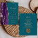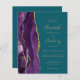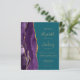 The left-hand edge features a purple watercolor agate border trimmed with gold faux glitter. The customisable text combines gold-coloured handwriting, copperplate and italic fonts on a teal blue background. The reverse side provides space for wedding details on a solid teal background, along with a QR code guests can scan to visit your website and RSVP, which saves the cost of printing and mailing separate RSVP cards.