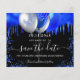 A black background decorated with royal blue drips, confetti, and balloons. Personalise and add a date and name/age. The text: Save the Date is written with a large trendy hand lettered style script.