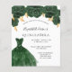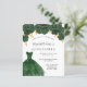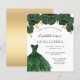 A modern, stylish and glamourous invitation for a Quinceañera, 15th birthday party. On the front: A white background with green faux glitter dust, an emerald green dress and green roses, florals. The name is written with a modern hand lettered style script. Personalise and add your party details.