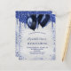 A girly and feminine birthday party invitation. On front: A faux silver background. Decorated with navy blue faux glitter drips, paint dripping look and balloons. Personalise and add a name and party details. The name is written with a hand lettered style script.
