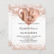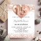 For an elegant Quinceañera, 15th birthday. A stylish white background. Decorated with rose gold, pink faux glitter, sparkles and balloons. Personalise and add a name, and party details. The name is written with a hand lettered style script, number 15 with balloon style fonts.