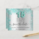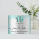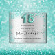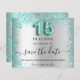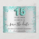 A girly and trendy Save the Date card for a Quinceañera, 15th birthday party. A faux silver looking background decorated with teal, green faux glitter dust. Personalise and add a date and name/age. The text: Save the Date is written with a large trendy hand lettered style script. Number 15 with a balloon style font.