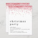 Red Glitter Confetti Christmas Party Invite. A budget price SMALLER 4.5” x 5.6” alternative. Available in a SEMI GLOSS 110 lb CARD STOCK which is the default option (recommended for invitations), OR a SATIN FINISH 80 lb THINNER PAPER STOCK (ideal for enclosures). Envelopes are an optional extra and are slightly larger than the card size. The header is large in stylish lowercase with the details beneath. Lots of white space for a contemporary feel and a border of confetti style red glitter at the top on both sides. Easily personalise the text to your own details.