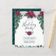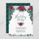 This rustic, boho design features a beautiful cascading watercolor bouquet of vintage burgundy red and white poinsettias along with small berries and lush winter foliage on the front at the top, including eucalyptus greenery and evergreen boughs, in shades of teal green with subtle gold detailing. Below the poinsettias is the text, "Please join us for a Holiday Party" in popular serif and calligraphy script typography for a hand-lettered look in dark teal green, followed by customisable text for the party details and more greenery and berries at the bottom. The back of the card features a rich teal green background with diagonal burgundy, pink and white stripes to match the front. You can personalise this item by changing the text in the product template.