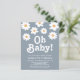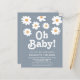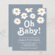 This budget floral baby shower invitation is decorated with daisies and stylish retro typography on a dusky blue background.