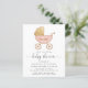 This cute budget-friendly baby girl shower invitation features a pastel pink and gold watercolor of a retro baby carriage. You can personalise the text on the carriage or leave blank. "baby shower" is written in a stylish script with swashes. You can easily personalise the shower details.