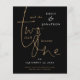 Romantic Quote Black Gold Wedding Save Date. A romantic quote And The Two Shall Become One is in a set stylish typography in gold with your names to the right and wedding date at the bottom which you can easily personalise on a black background with coordinating gold background on the other side. You can also change background colours on both sides to match your wedding colour theme if you wish via the Customise Further option as well as other edits. If you need any help please message me.