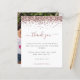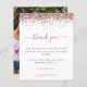 Rose Glitter Photo Hen Party Thank You. A budget price SMALLER 4.5” x 5.6” alternative. Available in a SEMI-GLOSS 110 lb CARD STOCK which is the default option (thicker for invitations), OR a SATIN FINISH 80 lb THINNER PAPER STOCK (ideal for enclosures). Envelopes are an optional extra and are slightly larger than the card size. A border of rose gold glitter is at the top, and Thank You is in a handwriting style script in dusty rose. Easily personalise the text to your own details. On the back swap in your favourite photo from your shower of portrait orientation.