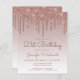 This trendy 21st birthday invitation features a sparkly rose gold faux glitter drip border and ombre background. The words "21st Birthday" and the name of the guest of honour appear in dark rose casual handwriting script, with the rest of the customisable text in sans serif font. The same rose gold glitter drip design appears on the reverse side.
