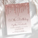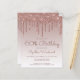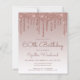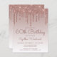 This trendy 60th birthday invitation features a sparkly rose gold faux glitter drip border and ombre background. The words "60th Birthday" and the name of the guest of honour appear in dark rose casual handwriting script, with the rest of the customisable text in sans serif font. The same rose gold glitter drip design appears on the reverse side.