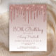 This glamourous 80th birthday invitation features a sparkly rose gold faux glitter drip border and ombre background. The words "80th Birthday" and the name of the guest of honour appear in dark rose casual handwriting script, with the rest of the customisable text in sans serif font. The same rose gold glitter drip design appears on the reverse side.