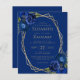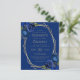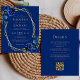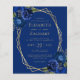 This design features a gold geometric frame decorated with royal blue watercolor floral bouquets and greenery, surrounding gold-coloured text on a royal blue background. The reverse side provides space for wedding details on a solid royal bluie background, along with a QR code guests can scan to visit your website and RSVP, which saves the cost of printing and mailing separate RSVP cards.