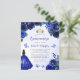 This lovely quinceañera invitation features a border of royal blue roses on a blue watercolor background. A gold tiara, a dark-haired girl in a royal blue princess dress and small blue butterflies decorate the text. The word "Quinceañera" and the name of the guest of honour appear in elegant royal blue handwriting script, with the remaining text in grey sans serif font. Add additional text on the back, along with a QR code to help your guests visit your quinceañera website and RSVP online.