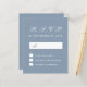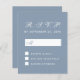 A simple, minimalist budget RSVP for a wedding. It has only white text on dusty blue background. The title RSVP and the letter M are written in an elegant calligraphic script, the rest in caps.