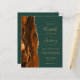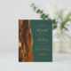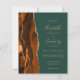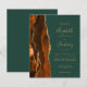 The left-hand edge of this elegant modern wedding invitation features a watercolor agate border in shades of burnt orange and rust, trimmed with faux gold glitter. The customisable text combines gold-coloured handwriting, copperplate and italic fonts on a dark green background. The reverse side is solid dark green. NOTE: Envelopes are not automatically included with these budget invitations, so please remember to choose the "white envelopes" option!