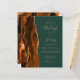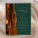 The left-hand edge of this elegant modern wedding invitation features a watercolor agate border in shades of burnt orange and rust, trimmed with faux gold glitter. The customisable text combines gold-coloured handwriting, copperplate and italic fonts on a dark emerald green background. The reverse side features a matching burnt orange, rust and gold agate design.