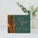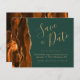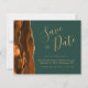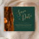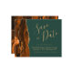This elegant budget save the date card features a burnt orange and rust watercolor agate border trimmed with faux gold glitter. The customisable text combines gold-coloured handwriting script, copperplate and italic fonts on an emerald green background. The reverse side features a matching burnt orange and gold agate design.