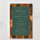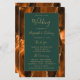This elegant, modern wedding program features a burnt orange and rust agate background trimmed with gold faux glitter. The text appears in elegant gold-colored handwriting and copperplate fonts on a dark green rectangle.
