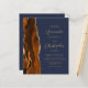 The left-hand edge of this elegant modern wedding invitation features a burnt orange and rust watercolor agate border trimmed with faux gold glitter. The customisable text combines gold-coloured script and sans serif fonts on a navy blue background. The reverse side provides space for wedding details on a solid navy blue background, along with a QR code guests can scan to visit your website and RSVP, which saves the cost of printing and mailing separate RSVP cards.