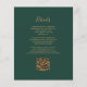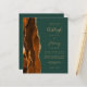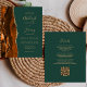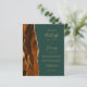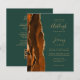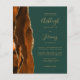 Save the cost of printing and mailing separate RSVP cards with this elegant modern all-in-one budget wedding invitation. The left-hand edge features a burnt orange and rust watercolor agate border trimmed with gold faux glitter. The customisable text combines gold-coloured handwriting, copperplate and italic fonts on an emerald green background. The reverse side provides space for wedding details on a solid green background, along with a QR code guests can scan to visit your website and RSVP.