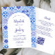 This rustic design features a background pattern of blue and white watercolor Portuguese tiles, or azulejos. Personalise it with the names of the bride and groom in blue calligraphy script and the remaining text in a combination of sans serif, copperplate and italics on a white arch shape. The reverse side provides space for wedding details on a solid white background, along with a QR code guests can scan to visit your website and RSVP, which saves the cost of printing and mailing separate RSVP cards.