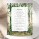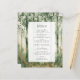 This wedding menu features a rustic watercolor forest landscape background in shades of green and gold. The customisable charcoal grey text appears on a rectangular white screen. The woodland scene is repeated on the back of the card.