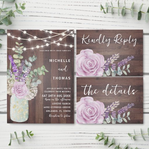 Gorgeous rustic inspired design incorporating original artwork of roses, lavender and eucalyptus in a vintage mason jar. Artistic elements and string lights are on a faux wood background with calligraphy in white.