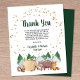 Budget-friendly rustic baby shower thank you card featuring a cute illustration of woodland animals with their tent camping in the mountains and forest, an overlay of gold stars and "Thank You" and the parent's names in a dark hunter green script.