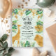 This "wild one" jungle safari themed baby shower invitation features gold faux foil animals (giraffe, lion and monkeys), gold and green jungle foliage, and a sprinkling of gold confetti on a pale green background. Add the name of the mum-to-be and shower details in black text. A coordinating jungle foliage pattern in green and gold decorates the back of the card.