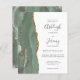 The left-hand edge of this elegant modern wedding invitation features a sage green watercolor agate border trimmed with faux gold glitter. The customisable text combines charcoal grey handwriting, copperplate and italic fonts on a white background. The reverse side features a matching sage green and gold agate design.