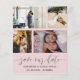 Cute save our date announcement. This template features space for 4 of your favourite couples photos in white with cool hand written calligraphy in dark grey. Easy to edit with your own unique details.
