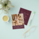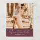 Chic script boho photo save the date flyer with your names, wedding date, location and wedding website in white elegant handwritten script calligraphy and modern typography on a burgundy background. Simply add your personal details and favourite photo! Exclusively designed for you by Happy Dolphin Studio. If you need any help or matching products, please contact us through our store chat. We're happy to help you make your wedding the most beautiful day!
